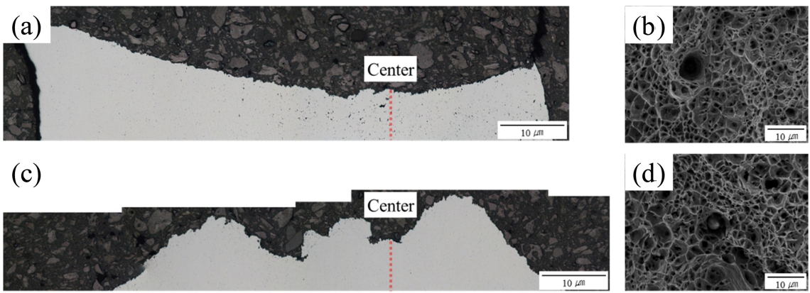 and (c) 0.10C, SEM fractography of 9Cr-1Mo-V-Nb weld metals of (b) 0.09C and (d) 0.10C