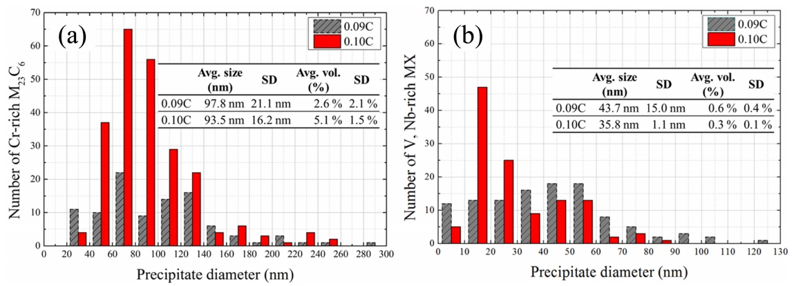 Number of (a) Cr-rich M23C6 precipitate and (b) (V, Nb)-rich MX precipitate distribution as a function of its