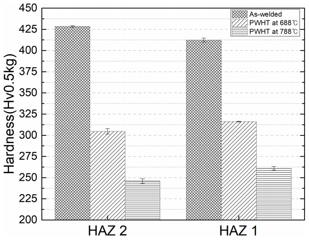 δ-페라이트 잔류로 인해 HAZ 2보다 낮은 반면 [20-22], PWHT 후에는 HAZ 1의 경도가 HAZ 2보다 높은 것으로 확인되었다. 즉, PWHT에 따른 연화 정도는 상대적으로 HAZ 1에서 작게 나타났다.