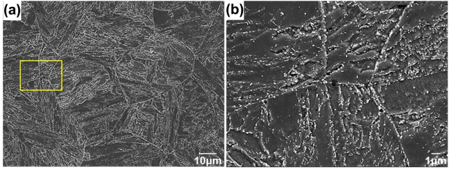 SEM micrographs: (a) HAZ 2, (b) higher magnification image taken from the rectangular