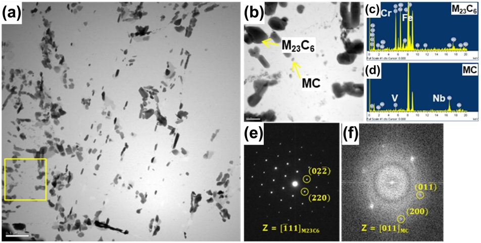 pattern of the M23C6-type carbide shown in (b), and (f) FFT pattern of the MC-type carbide shown in (b).