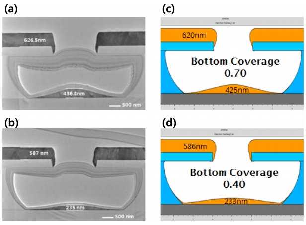 films deposited on a deep contact of aspect ratio 10 (a diameter of 5 μm) (a) at the