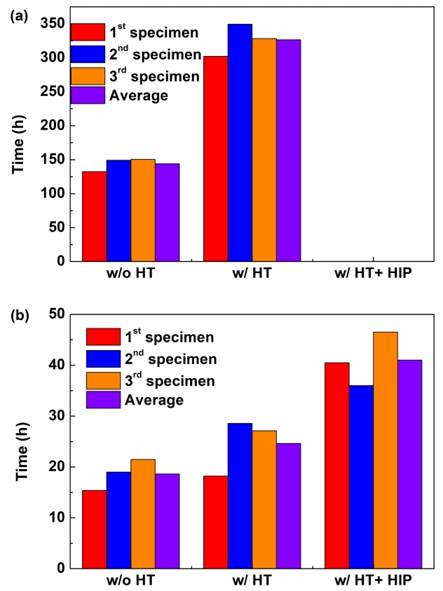 Stress-rupture time at the condition of (a) 871 ℃, 310.26 MPa and (b) 982 ℃, 186.16