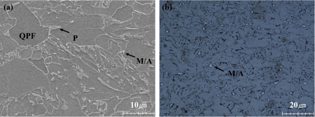 microscopy (SEM). Specifically, the martensite/austenite (M/A) phase was observed