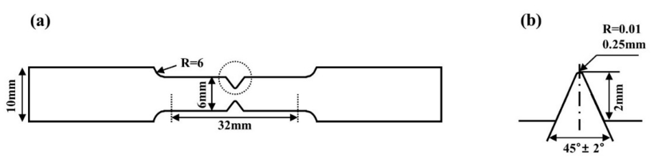 Geometry for the HIC specimen: (a) schematic dimensions of the notched tensile specimen