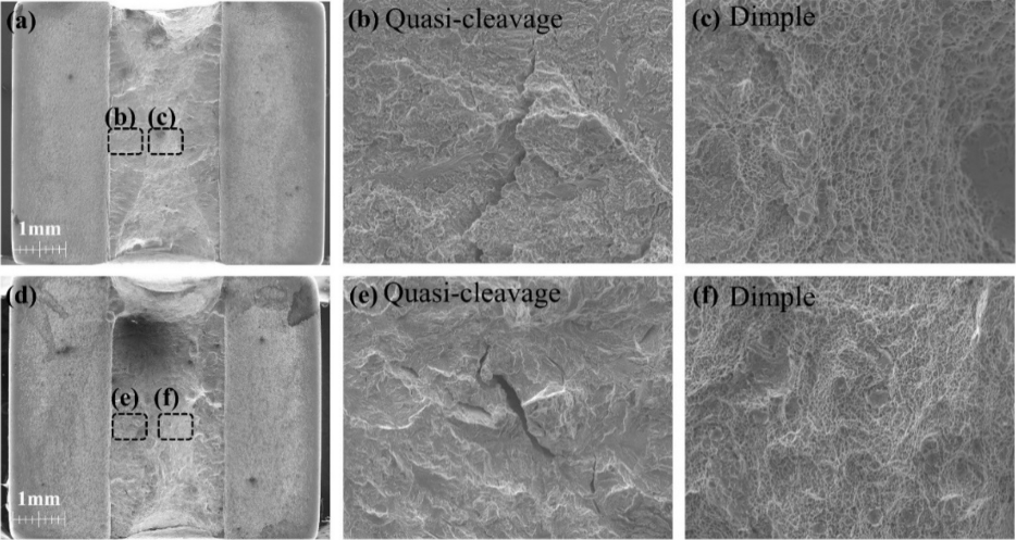 edge region, (f) the center of fracture surface for LB welds