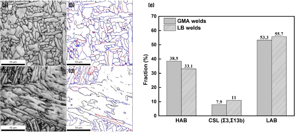 grain boundary distribution for GMA and LB welds.