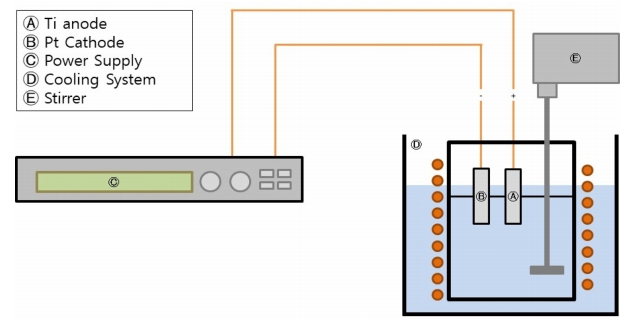 TIO2 나노튜브를 형성하기 위해 DC전원장치의 양극과 음극에 각각 준비한 타이타늄 시편과 백금 메쉬망을 연결 후 20 mm 떨어진 위치에 마주하도록 고정하고