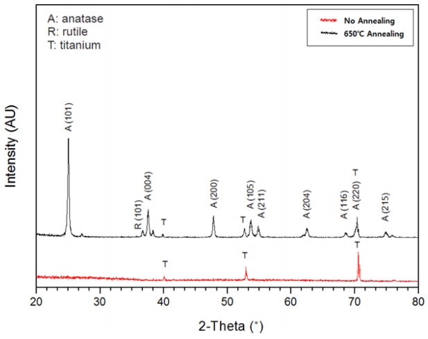 XRD피크가 나오지 않지만 얇은 산화막 두께와 다공성 구조로 인하여 Ti 피크가 검출되기도 하였다. 반면 나노튜브가 형성된 타이타늄 기판을 650