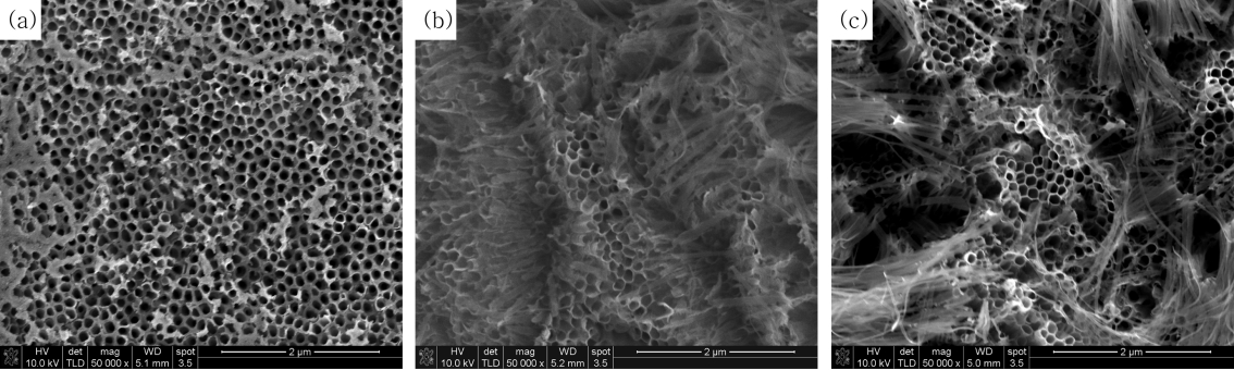그림 2는 타이타늄을 60V 정전압 조건하에서 Ethylene glycol + NH4F + 2 vol% H2O 용액의 NH4F 조성을 (a) 0.2 wt%, (b) 0.4 wt%, (c) 0.6 wt%으로 달리하여 1시간 동안 양극산화 후 나노튜브의 윗부분을 HR FE-SEM