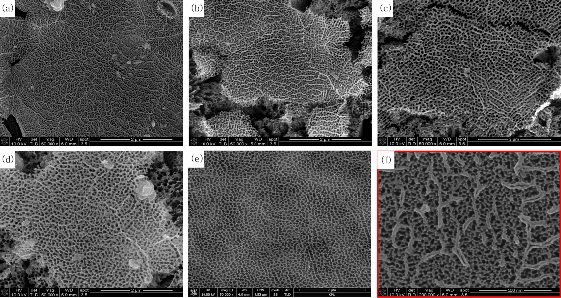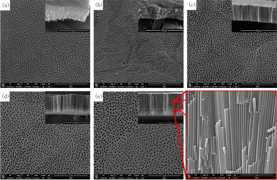 그림 3은 타이타늄을 60 V 정전압 조건하에서 Ethylene glycol + 0.2 wt% NH4F + H2O 용액의 H2O 조성을 (a) 0 vol%, (b) 2 vol%, (c) 4 vol%, (d) 6 vol%, (e) 8 vol%으로 달리하여 1시간 동안 양극산화