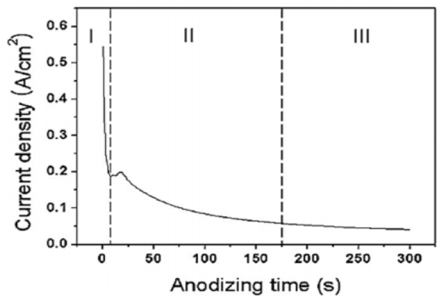 그림 7은 양극산화 시간에 따라 변화하는 전류밀도의 변화를 나타낸 그래프이다. I구간은 인가전압까지 도달하면서 전류가 급격하게 감소하는 거동을 보이며, 공급되는