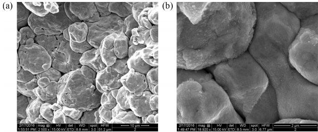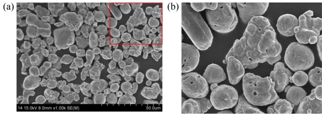 microscopy (SEM) images of the powder are shown in Fig. 1, with spheroidal particles of 14 ~ 25 μm in size. Figure 1 (b) is a magnified image of the box in (a) to show the pores on the particle surfaces.