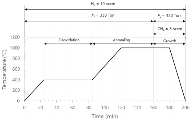The CVD apparatus used in this work had a gas distribution system consisting of H2 (99.999%) and CH4 (99.995%) flowing through each mass flow controller into a quartz
