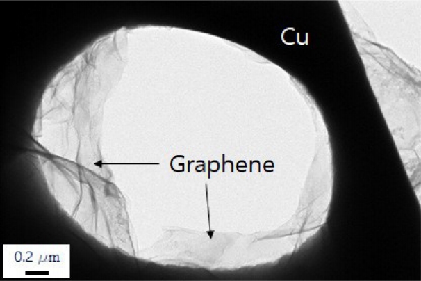 thus is connected continuously in three dimensions throughout the Cu matrix. Figure 6 shows TEM images of the graphene on Cu. The grain above graphene was removed by electrolyte