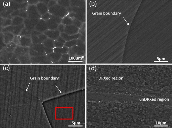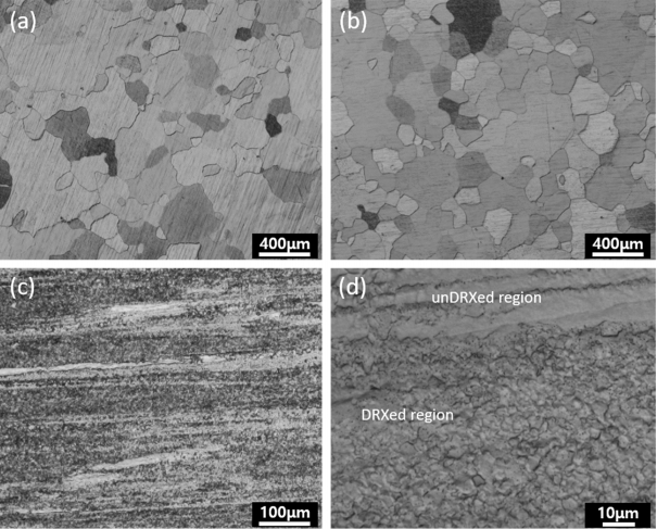 그림 1(a)-(d)는 각각 시효처리 전/후, 압출공정에서 얻은 Mg-3 wt% Zn 합금의 미세조직을 보여주는 광학현미경 이미지이다. 그림 1(a)-(b)는 시효처리 전/후의 미세조직 이미지이며 이미지로부터 시효처리 전/후 결정립의 크기는 변함이 없음을 알 수 있다. 그림 1(c)는 Mg-3 wt% Zn 합금 압출재의 저배율 미세조직 이미지이며 압출재는 압출방향을 따라 변형된 결정립 (unDRXed grain)과 동적재결정(dynamic