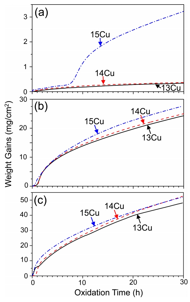 The oxidation kinetics of Fe-12Cr-0.3C-4Mn-(13, 14, 15)Cu alloys are depicted in Fig 2. At 700 oC, the (13, 14)Cu alloys oxidized quite slowly, while the 15Cu alloy suffered breakaway