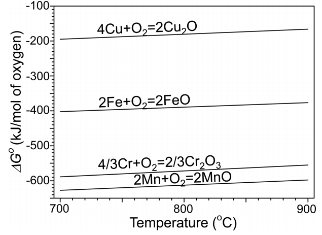 is shown in Fig 3 [10]. Oxide stability increases in the order of Cu2O, FeO, Cr2O3, and MnO. The secondary phase was rich in both the most noble Cu and the most active