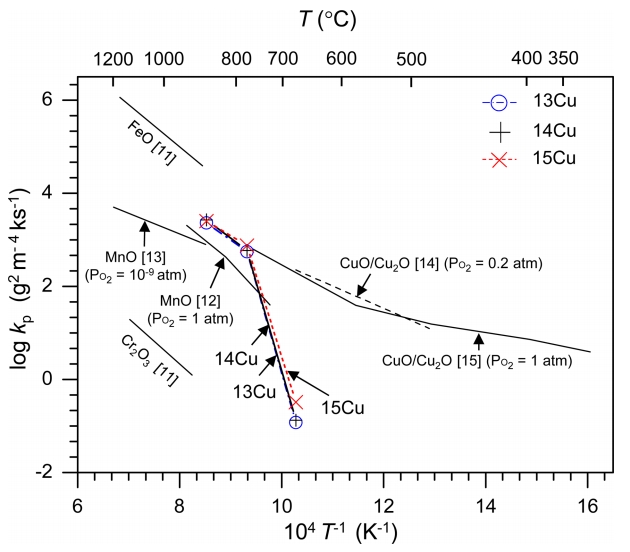 entire oxidation period. The kp values of the pure metals decreased in the order of Fe [11], Mn [12,13] or Cu [14,15], and Cr [11]. The kp values of the Fe-12Cr-0.3C-4Mn-(13, 14, 15)Cu alloys were located between those of