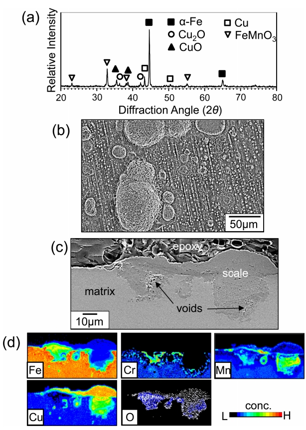 Figure 5 shows the XRD/SEM/EPMA results of the Fe-12Cr-0.3C-4Mn-13Cu alloy after oxidation