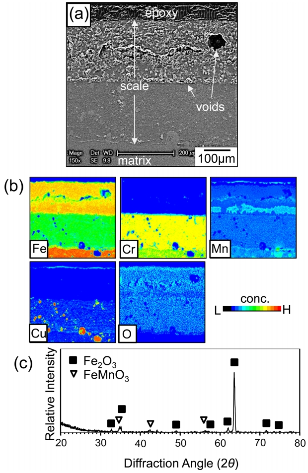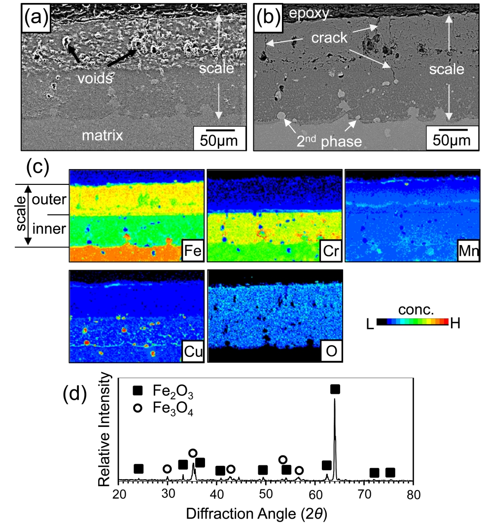 which depleted Fe and thereby enriched Cr in the inner oxide layer (Fig 6(c)). The outer oxide scale consisted mainly of Fe2O3 and some Fe3O4, and was dissolved with Cr, Cu, and Mn (Figs 6(c-d)). A small amount of the unoxidized secondary phase containing the most noble element,