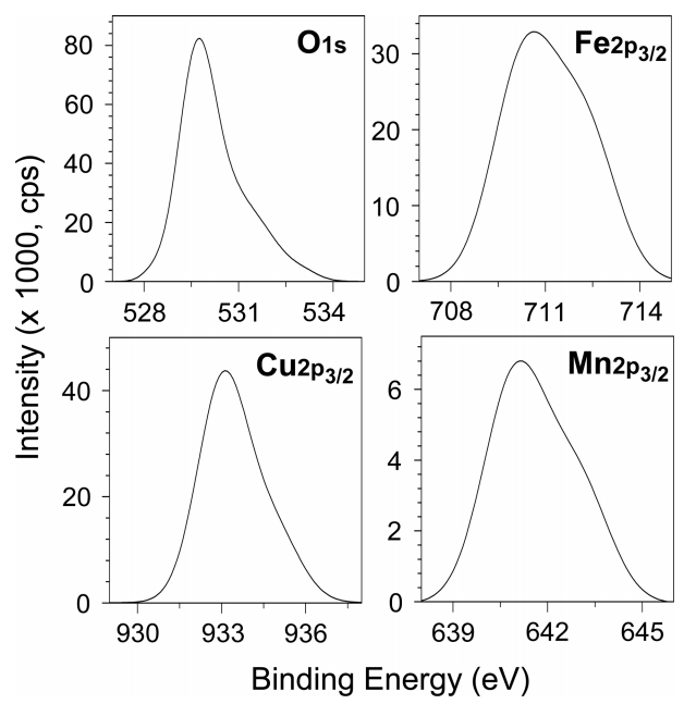 which closely matches the binding energies of Fe2O3 (710.9 eV) [20], CuO (933.6 eV) [20], and MnO (640.3eV) [21]. The small deviation in binding energies may be attributed to the dissolution of