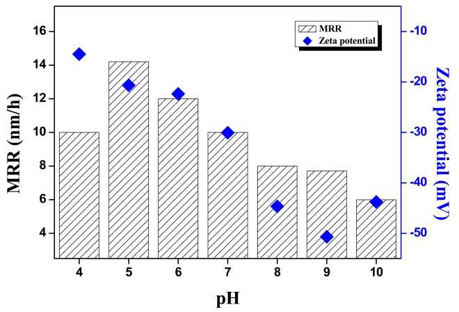 The MRR and zeta potential of the colloidal silica slurry with different pH were characterized