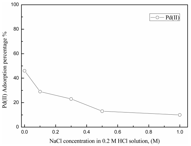본 연구의 염산농도 실험범위에서 팔라듐(II)은 PdCl42- 단일 화학종으로 존재한다. 그러나 염산 농도 0.2 M에서 1.0 M 농도 범위에서 염산 농도가 증가함에 따라 UIO-66-NH2로의 팔라듐(II) 흡착률이 감소하였다. 따라서 염소이온농도가 팔라듐(II)의 흡착에 미치는 영향을 조사하기 위해 0.2 M 염산 용액에 염화나트륨를