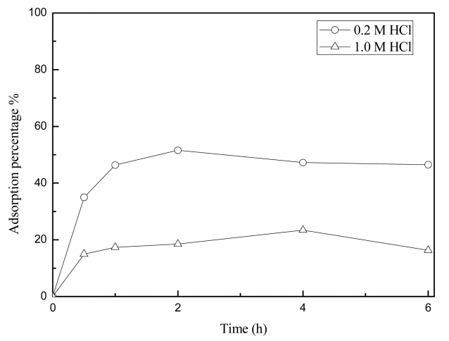 흡착률은 감소했다. 염산 농도 증가에 따라 흡착률이 감소하는 이유는 염소 이온 농도의 증가에 따른 영향으로 생각되며, 3.2절에서 이의 영향을 고찰했다.