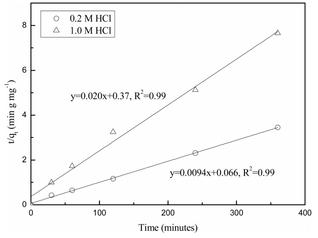 위해 팔라듐(II)의 농도가 100 mg/L인 용액을 대상으로 UIO-66-NH2의 농도와 실험용액의 부피를 각각 0.5 g/L와 10 mL로 조절하여 반응시간을 30분에서 6시간까지 변화시켰다. 그림 3에 의하면 UIO-66-NH2는 두 염산농도 용액에서 2시간 만에 흡착 평형에 도달했다. 팔라듐(II)의 UIO-66-NH2 흡착 반응속도에 대한 정량적 정보를 얻기 위해 고체상의 흡착 평형능력을 기반으로 유도된 2차 반응속도 모델(pseudo-second-order kinetic