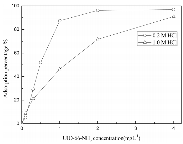 UIO-66-NH2의 농도가 팔라듐(II) 흡착에 미치는 영향을 조사하기 위해 0.2 M과 1.0 M 염산용액에서 UIO-66-NH2의 농도를 0.2 g/L에서 4 g/L까지 변화시켰다. 그림 5에 따르면 0.2 M 염산 용액의 경우 UIO-66-NH2의 농도가 2 g/L인 조건에서 팔라듐 100 mg/L가 대부분 흡착되었다. 그러나 1.0 M 염산 용액의 경우 UIO-66-NH2의 농도 4 g/L 조건에서 90% 정도 팔라듐(II)이 흡착된다.