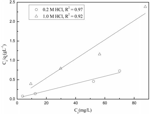 상기 식에서 qe는 단위 질량당 평형상태에서의 팔라듐(II) 이온의 교환 용량(mg/g), qm은 단위 질량당 평형상태에서 팔라듐(II) 이온의 최대 교환 용량(mg/g), Ce는 흡착 실험 후 용액에서 팔라듐(II) 이온 농도(mg/L), K는 Langmuir 상수이다(L/mg). 실험에서 얻은 자료를 상기 Langmuir