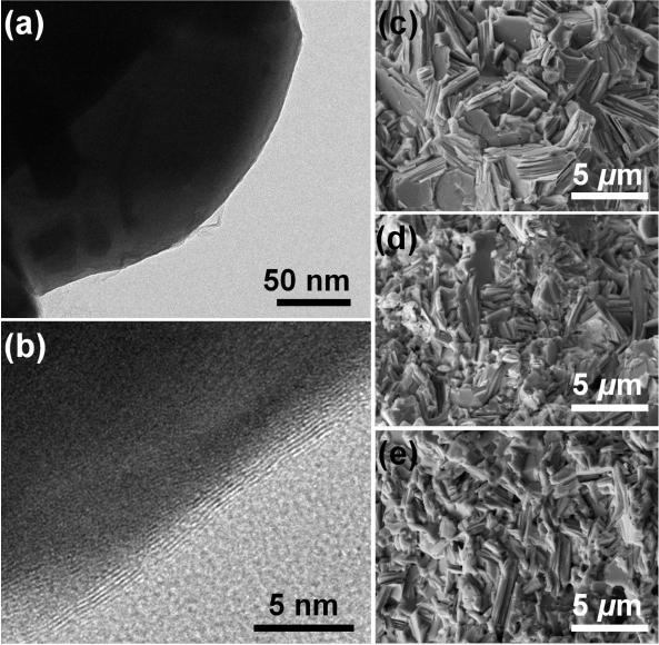 이상과 같이 제작된 복합체의 파단면을 SEM으로 관찰하였다. 그림 2(c)-(e)에서 보이듯 입계는 무질서한 방위로 존재하며, 따라서 소결에 따른 BTS의 우선배향은 무시할만한 수준임을 알 수 있다, 특히, RGO의 함량이 증가함에