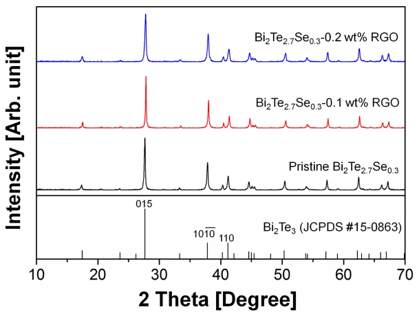 그림 3은 BTS-GO 복합분말을 소결하여 제작한 BTSRGO 복합체의 XRD pattern을 보여준다. 모든 복합체에서 회절 pattern은 Bi2Te3의 표준 분말회절 pattern (JCPDS #15-0863)과 잘 일치하였으며, 상대강도 역시 유사한 것으로 보아 복합체 내에서 각각의 결정립은