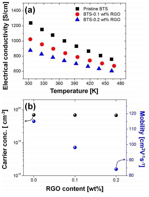그림 4(a)는 BTS-RGO 복합체의 온도에 따른 전기전도도를 나타낸다. 모든 시료에서 전기전도도가 온도 증가에 따라 감소하였으며, 이를 통해 격자산란(lattice