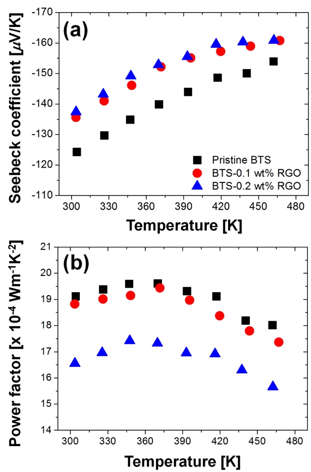 (a) Temperature-dependent Seebeck coefficients and (b) power factors of the BTS-RGO
