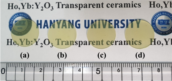 Figure 4 shows a photograph of the 1-mm-thick Y2O3:Ho3+,Yb3+ specimens, both sides of which were mirrorfinished after vacuum sintering (1625 °C,