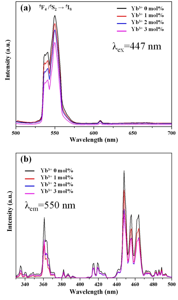 Figure 6(a) shows the effect of Yb3+ content on down-conversion photoluminescence intensity. Irradiation at 447 nm resulted