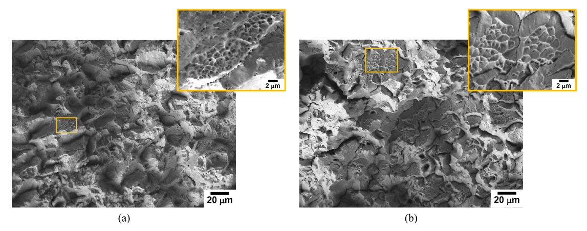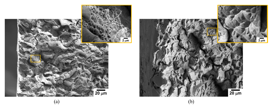The SEM fractographs of (a) Fe18Mn3Cr0.1N and (b) Fe19Mn19Cr0.6N specimens, SSRTed