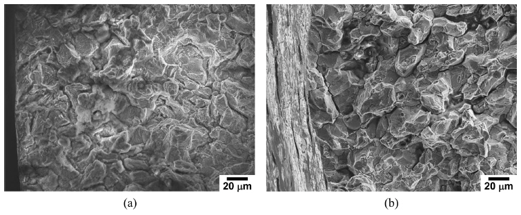 ๊ณํ๋จ ์์์ M23C6 ํํ๋ฌผ์ด ์กด์ฌํ๋ Fe19Mn19Cr0.6N๊ฐ์ด Fe18Mn3Cr0.1N๊ฐ์ ๋นํด ๋ค์ ๋์ ๊ฒ์ ์ ์ ์๋ค. ๊ทธ๋ฆผ 10๊ณผ 11์ (a) Fe18Mn3Cr0.1N๊ฐ๊ณผ (b) Fe19Mn19Cr0.6N๊ฐ์ ์ธ๊ณตํด์๋ถ์๊ธฐ์์ ์๊ทน์ฉํด(๊ทธ๋ฆผ 10) ๋ฐ ์๊ทน๋ฐฉ์(๊ทธ๋ฆผ 11) ์กฐ๊ฑด์์ ์ ์์ธ์ฅ์ํํ ํ์ ํ๋ฉด์ SEM์ ์ด์ฉํ์ฌ ๊ด์ฐฐํ ์ฌ์ง์ ๋ณด์ฌ์ฃผ๊ณ ์๋ค. ์ธ๊ณตํด์๋ถ์๊ธฐ์์๋ ํ๋ฉด์ ์๋ ฅ๋ถ์๊ท ์ด์ด ์์ฑ๋๋ฉด์ ๊ท ์ด์ด