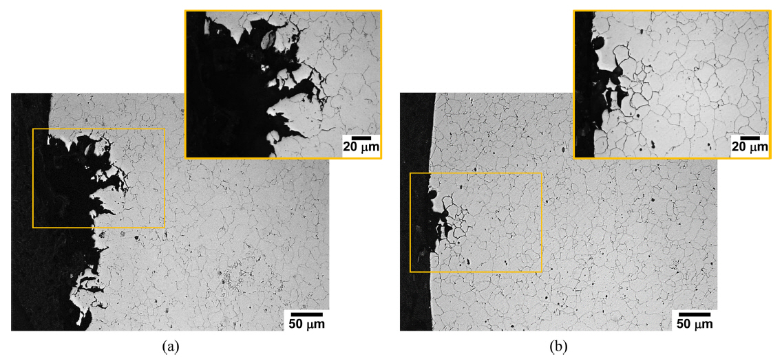at a strain rate of 1ร10-6s-1 in artificial seawater under a anodic applied potential of Ecorr + 0.1 VSCE. The specimens were cut perpendicular to the loading direction, polished and etched
