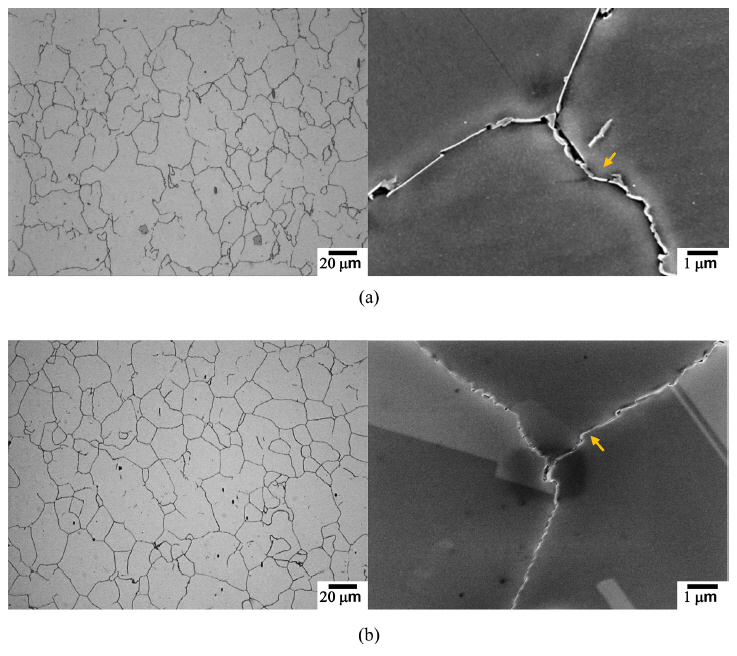 The optical and SEM micrographs of (a) Fe18Mn3Cr0.1N and (b) Fe19Mn19Cr0.6N specimens.