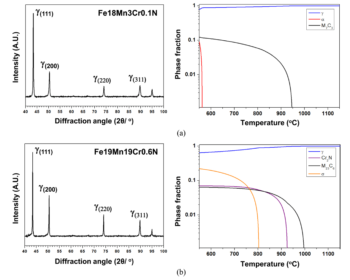 The x-ray diffraction patterns and equilibrium phase diagrams calculated for (a) Fe18Mn3Cr0.1N