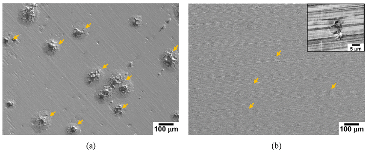 ์ด๋ฌํ ๊ฒฝํฅ์ ์ธ๊ณตํด์๋ถ์๊ธฐ์์ ์ ์์ธ์ฅ์ํํ ํ ์ํธ์ ํ๋ฉด ๊ด์ฐฐ์ ํตํด์๋ ํ์ธ๋๊ณ ์๋ค. ๊ทธ๋ฆผ 8์ (a) Fe18Mn3Cr0.1N๊ฐ๊ณผ (b) Fe19Mn19Cr0.6N๊ฐ์ ์ธ๊ณตํด์๋ถ์๊ธฐ์์ ๊ฐ๊ฐ ์๊ทน์ฉํด ๋ฐ ์๊ทน๋ฐฉ์ ์กฐ๊ฑด์์ ์ ์์ธ์ฅ์ํํ ํ