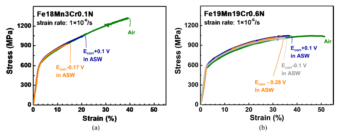 The slow strain rate test results of Fe18Mn3Cr0.1N and Fe19Mn19Cr0.6N specimens which
