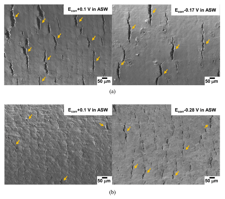 SSRTed at a strain rate of 1ร10-6s-1 in artificial seawater under anodic and cathodic potentials.