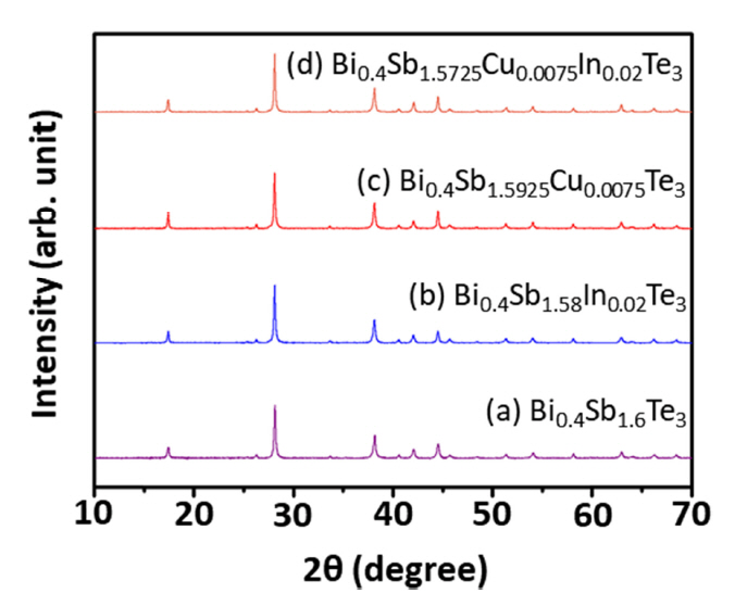 XRD pattern of Bi0.4Sb1.6-x-yCuxInyTe3 bulk samples, where (x, y) = (0.0, 0.0), (0.0, 0.02), (0.0075, 0.0), (0.0075, 0.02).