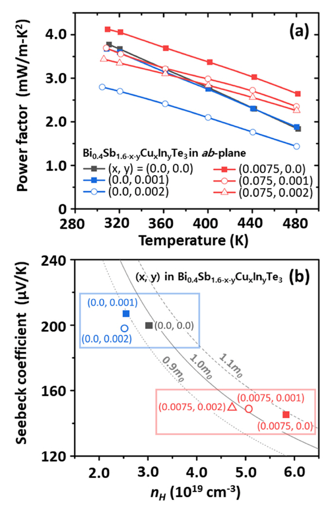 (a) Power factor and (b) Pisarenko plot for the Bi0.4Sb1.6-xyCuxInyTe3 (x=0.0, 0.0075, y=0.0, 0.01, 0.02) at 300 K (m0=electron rest mass).