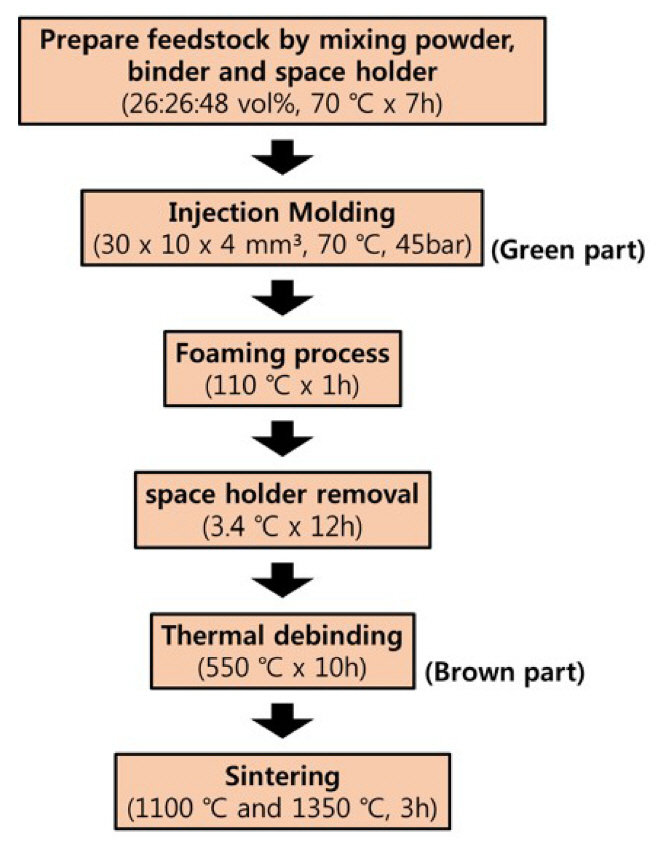 사출성형공정과 탈지공정 사이에 스페이스 홀더를 팽창시키는 발포공정과 스페이스 홀더를 제거하는 단계를 추가하였다. 이와 관련된 전 공정을 그림 1에 나타내었다.