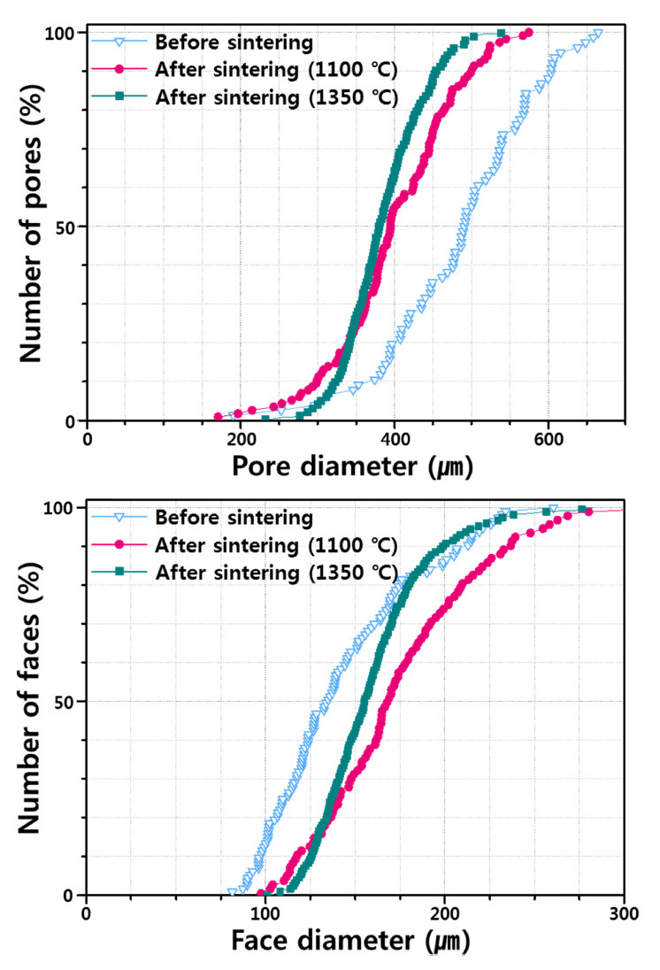 결과 (그림 4), 소결 후 기공의 크기는 다공체 시편의 수축에 의하여 작아지는 반면 페이스의 크기는 오히려 커졌다. 소결 후 페이스의 크기가 증가하는 현상은 페이스를